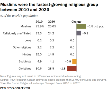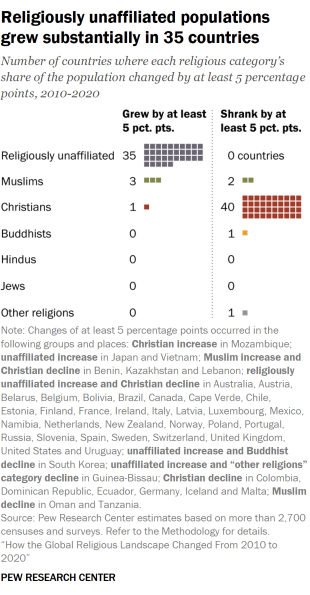 According to the same study, people who were religiously unaffiliated were also the second fastest-growing religious category after Muslims. While most religious categories declined in their share of the world population between 2010 and 2020, the religiously unaffiliated gained nearly 1 percentage point as they increased in number.